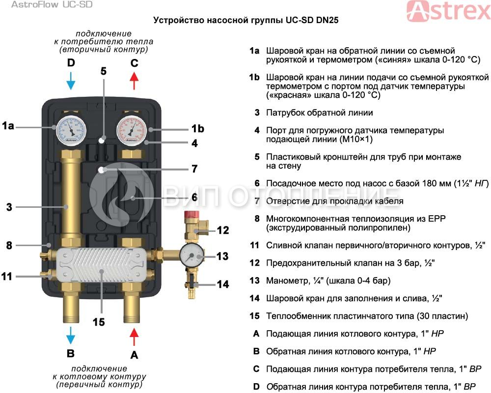 Группы «AstroFlow UC-SD» являются прямыми, они оснащены шаровыми кранами со съемными рукоятками, в которых вставлены стальные термометры со шкалой от 0 до 120 °С, позволяющие оценить температурный перепад в контуре. Термометры имеют цветовую маркировку – «красный» для подающей линии, «синий» – для обратной. В шаровом кране на подаче также предусмотрено место для установки погружного датчика температуры. Основу разделения контуров составляет нержавеющий теплообменник с 30 пластинами мощностью 32 кВт. Подключения к первичному контуру находятся снизу блока и имеют наружную резьбу 1". Подключения ко вторичному контуру с внутренней резьбой 1" расположены сверху, на шаровых кранах. Вторичный контур снабжен группой безопасности, включающей манометр со шкалой от 0 до 4 бар, предохранительный клапан, срабатывающий при давлении выше 3 бар, а также шаровой кран для заполнения и слива. На линии подачи группы предполагается установка циркуляционного насоса с монтажной длиной 180 мм (крепится с помощью накидных гаек 1½").