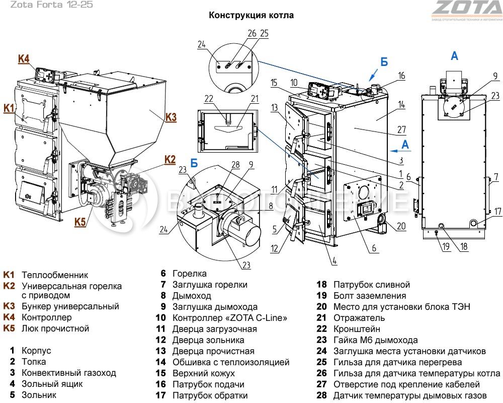 В случае, когда в бункере закончилось топливо, предусмотрена возможность монтажа электрического нагревательного элемента. В котел с автоматической подачей топлива «Zota Forta» можно установить блок ТЭНов мощностью 9 кВт, подключаемый к трех- (~380 В) или однофазной сети (~220 В) через отдельный пульт управления.