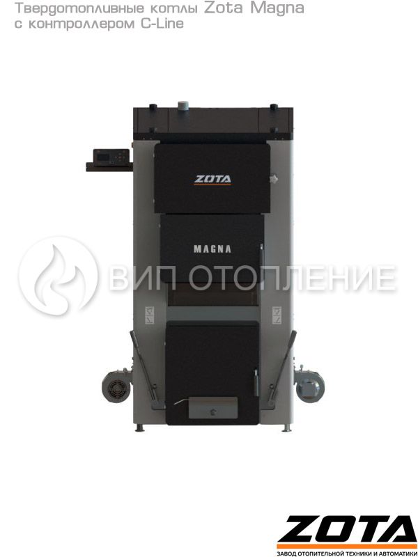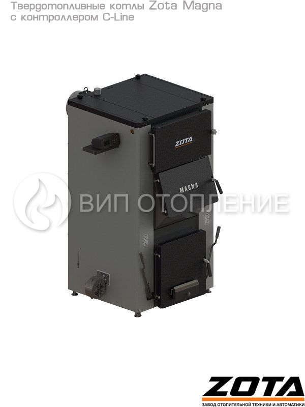 Стальной твердотопливный полуавтоматический котел «Zota Magna 100» мощностью 100 кВт предназначен для теплоснабжения индивидуальных жилых домов и зданий коммунально-бытового назначения площадью до 1000 м2, оборудованных системой водяного отопления с принудительной циркуляцией. Изготавливается в исполнении для умеренных и холодно-климатических зон. Конструкция котла позволяет работать в системах с давлением теплоносителя до 3 бар и максимально допустимой температурой 80 °C. Комплектуется новым контроллером «C-Line».