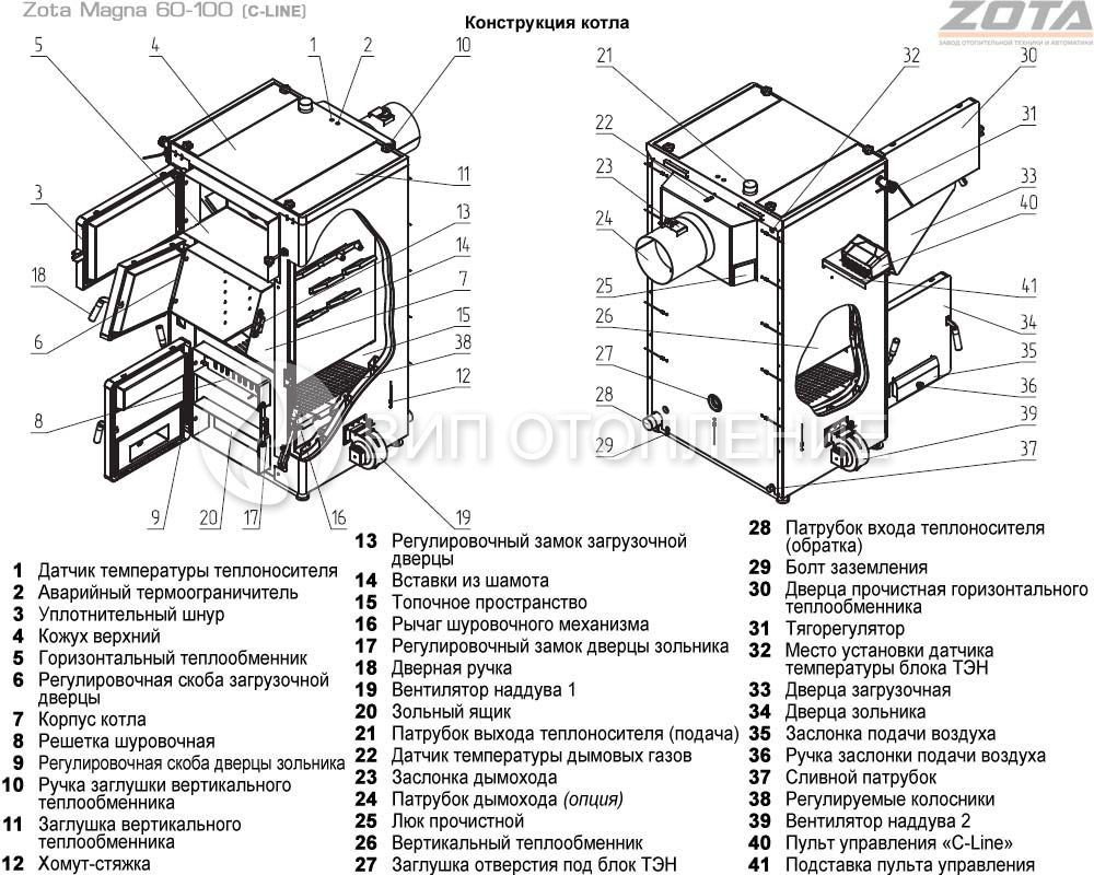 Теплообменник котлов «Zota Magna» состоит из горизонтальных трубных и вертикальных поверхностей, образуя конструкцию наименьших габаритов. Такой комбинированный теплообменник в совокупности с использованием шамотных кирпичей позволяет получить наибольший КПД методом эффективного дожигания газов. Шамотные кирпичи, развивая высокую температуру, дополнительно дожигают попадающие на их поверхность частицы топлива, благодаря чему на стенках котла собирается меньше сажи. Внутри топки установлены подвижные регулируемые колосники, для удобства чистки от золы которых существует механизм встряхивания, работающий без открытия загрузочной и прочистной дверец.