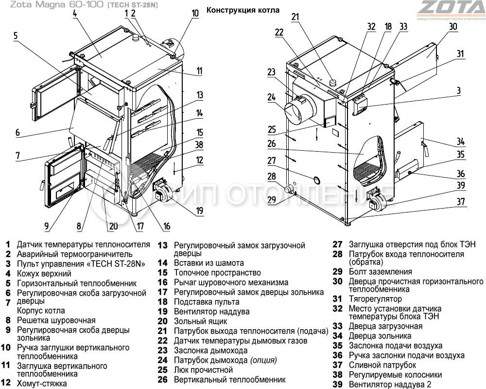 В котле «Zota Magna» предусмотрена возможность установки электронагревательного элемента (блока ТЭН), служащего для поддержания рабочей температуры теплоносителя при отсутствии основного топлива (приобретается дополнительно).