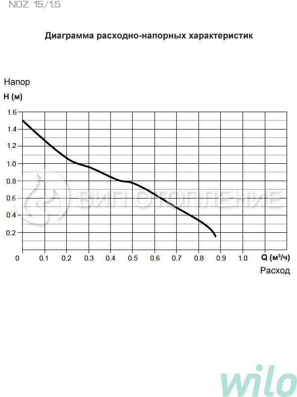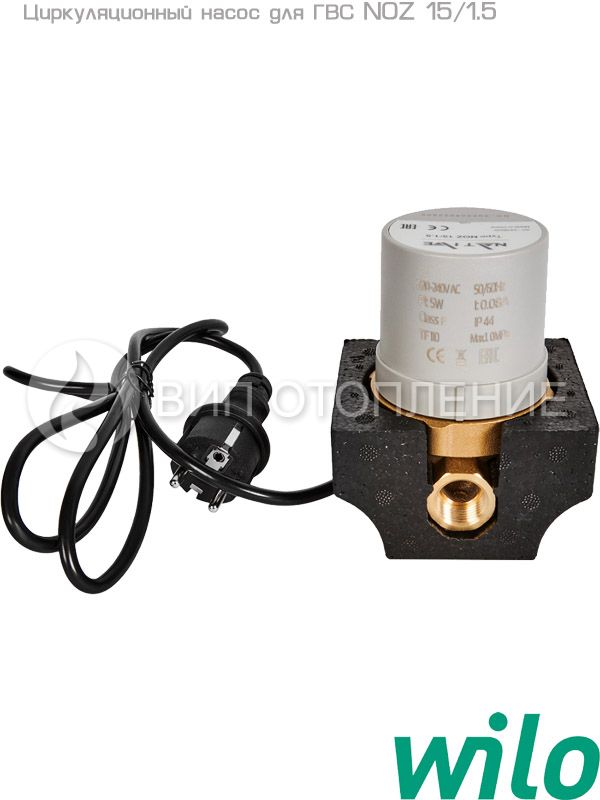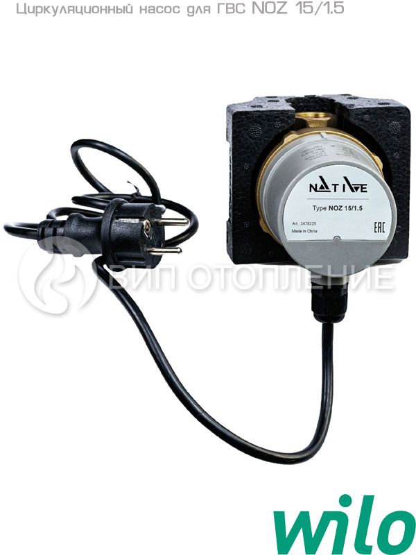 Циркуляционный насос «Wilo Native NOZ» предназначен для принудительной циркуляции жидкости в системах горячего водоснабжения. В серии представлена модель «NOZ 15/1,5» с однофазным двигателем с мокрым ротором. Мотор имеет тепловую защиту. Насос перекачивает воду, температура которой находится в пределах от +2 до +110 °C, рабочее давление системы не должно превышать 10 бар. Максимальный напор воды составляет 1,5 метра (при нулевом расходе).