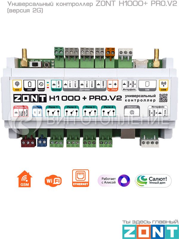 Универсальный контроллер «ZONT H1000+ PRO.V2» предназначен для профессиональной автоматизации работы, дистанционного контроля и управления системами отопления и другими инженерными система по программируемому алгоритму. Управление осуществляется через веб-сервис и мобильное приложение с использованием передачи данных по каналам связи GSM,Wi-Fi и Ethernet. Это обновленная версия контроллера «ZONT H1000+ PRO», оснащенная GSM-модемом со связью 4G, аналоговым входом 4-20 мА и вторым дополнительным входом RS-485 для подключения устройств, поддерживающих цифровой протоколModbus RTU. Широкий функционал прибора позволяет использовать различные сценарии для управления сложными системами отопления, обеспечивает безопасность их работы, позволяет сократить потребление энергоресурсов, тем самым создавая для пользователей максимально комфортные условия проживания.