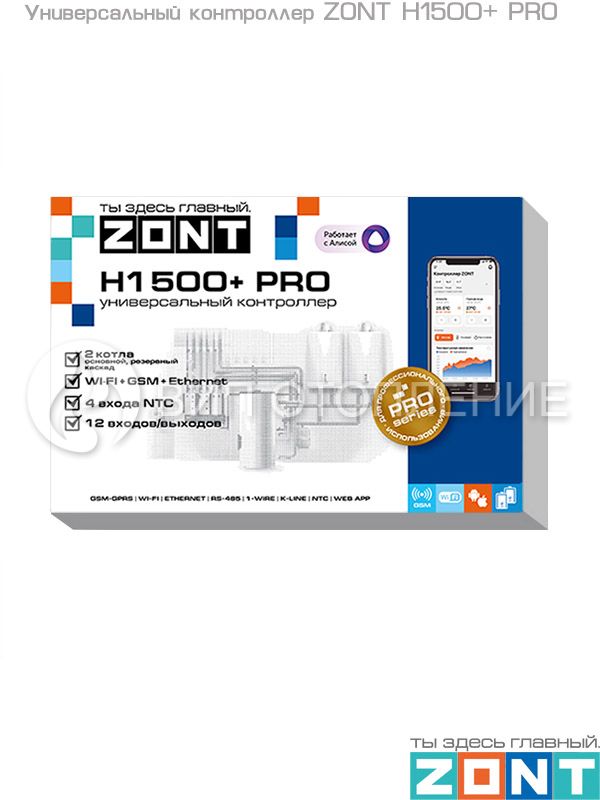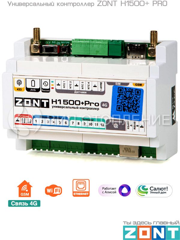 Универсальный контроллер «ZONT H1500+ PRO» предназначен для профессиональной автоматизации работы, дистанционного контроля и управления системами отопления и другими инженерными система по программируемому алгоритму. Управление осуществляется через веб-сервис и мобильное приложение с использованием передачи данных по каналам связи GSM,Wi-Fi и Ethernet. Широкий функционал прибора позволяет использовать различные сценарии для управления системами отопления, обеспечивает безопасность их работы, позволяет сократить потребление энергоресурсов, тем самым создавая для пользователей максимально комфортные условия проживания.