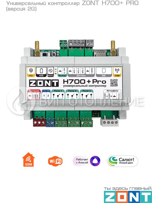 Универсальный контроллер «ZONT H700+ PRO» – устройство для профессиональной автоматизации инженерных систем и дистанционного управления ими по программируемому алгоритму через веб-сервис и мобильное приложение с использованием передачи данных по каналам связи GSM и Wi-Fi.
