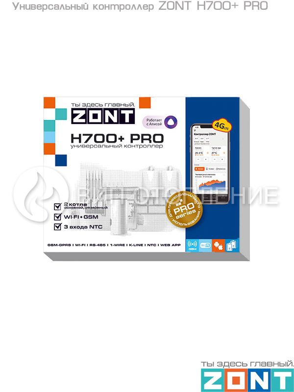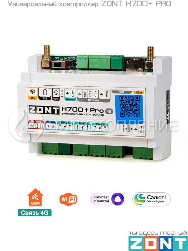 Универсальный контроллер «ZONT H700+ PRO» предназначен для профессиональной автоматизации работы, дистанционного контроля и управления системами отопления с функцией приготовления горячей воды по программируемому алгоритму. Управление осуществляется через веб-сервис и мобильное приложение с использованием передачи данных по каналам связи GSM и Wi-Fi. Широкий функционал прибора позволяет использовать различные сценарии для управления инженерными системами, обеспечивает безопасность их работы, позволяет сократить потребление энергоресурсов, тем самым создавая для пользователей максимально комфортные условия проживания.