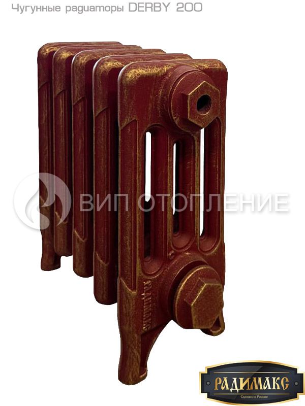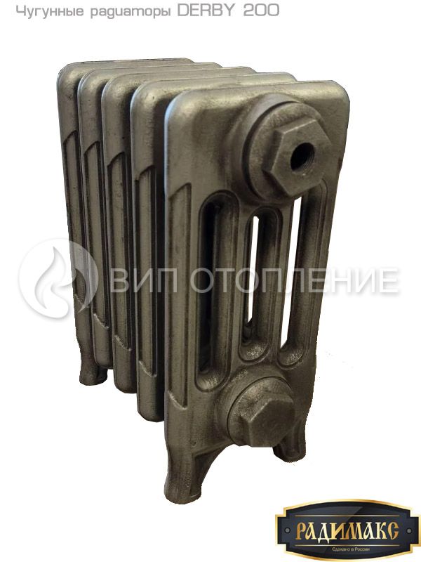 Конструктивно модель «DERBY 200-9» представляет собой 9 отдельные четырехрядные секции, выполненные из высококачественного чугуна и соединенные стальными ниппелями в коллекторной части. Межосевое расстояние составляет 200 мм. Прибор подготовлен для бокового подключения к трубопроводу. Размер резьбы G ½" или G ¾" и варианты расположения заглушек оговариваются при заказе (комплект подключения в стоимость прибора не входит).