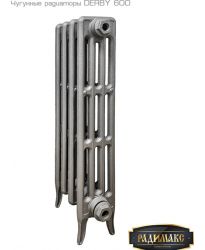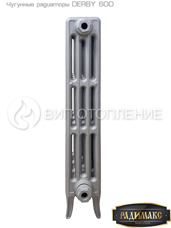 Конструктивно модель «DERBY 600-9» представляет собой 9 отдельные четырехрядные секции, выполненные из высококачественного чугуна и соединенные стальными ниппелями в коллекторной части. Межосевое расстояние составляет 600 мм. Прибор подготовлен для бокового подключения к трубопроводу. Размер резьбы G ½" или G ¾" и варианты расположения заглушек оговариваются при заказе (комплект подключения в стоимость прибора не входит).