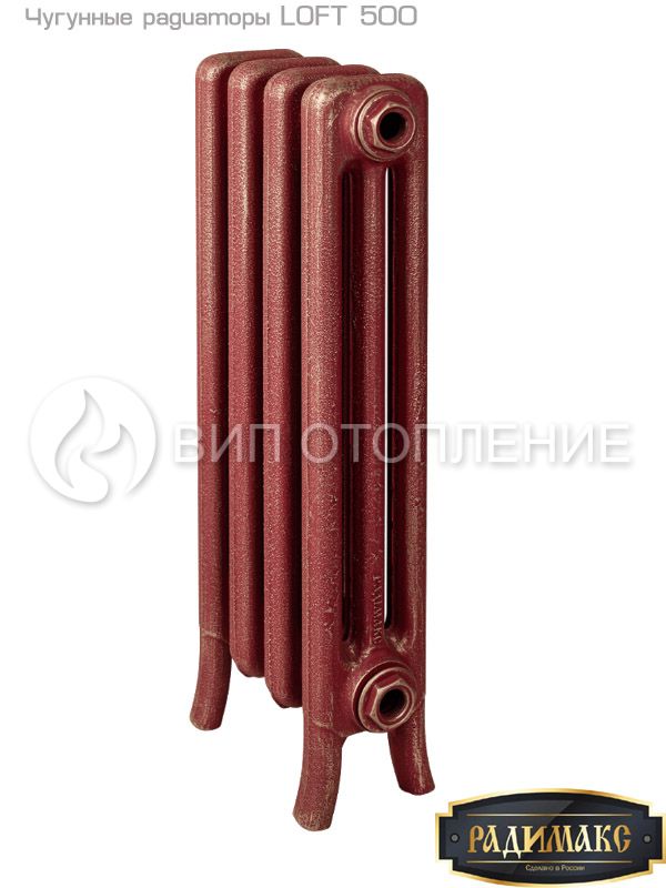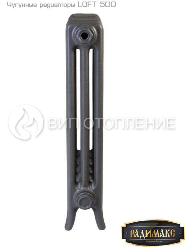 Радиаторы чугунные секционные «РАДИМАКС LOFT 500» предназначены для применения в системах водяного отопления жилых, административных и общественных зданий. Рассчитаны на эксплуатацию при максимальной температуре теплоносителя 110 °С и рабочем давлении до 10 атм. Приборы испытаны на заводе давлением не менее 16 атм. и опрессованы для выявления возможных протечек и скрытых дефектов.