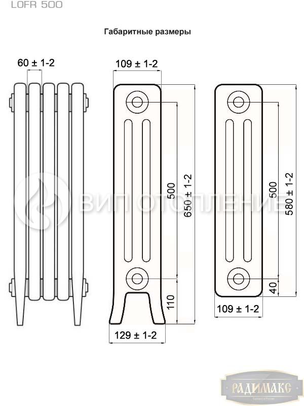 Конструктивно модель «LOFT 500-10» представляет собой 10 отдельных трехрядных секций, выполненных из высококачественного чугуна и соединенных стальными ниппелями в коллекторной части. Межосевое расстояние составляет 500 мм. Прибор подготовлен для бокового подключения к трубопроводу. Размер резьбы G ½" или G ¾" и варианты расположения заглушек оговариваются при заказе (комплект подключения в стоимость прибора не входит).