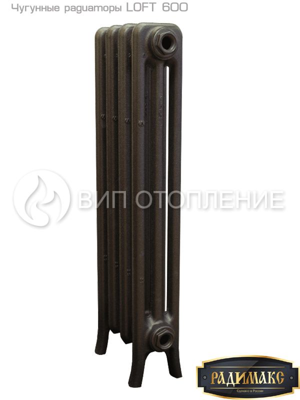 Радиаторы чугунные секционные «РАДИМАКС LOFT 600» предназначены для применения в системах водяного отопления жилых, административных и общественных зданий. Рассчитаны на эксплуатацию при максимальной температуре теплоносителя 110 °С и рабочем давлении до 10 атм. Приборы испытаны на заводе давлением не менее 16 атм. и опрессованы для выявления возможных протечек и скрытых дефектов.
