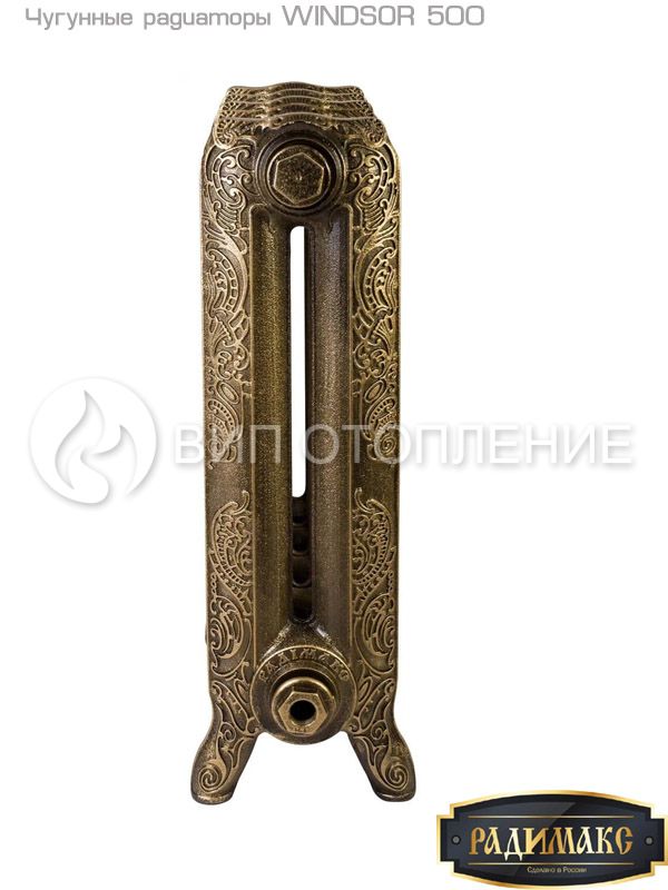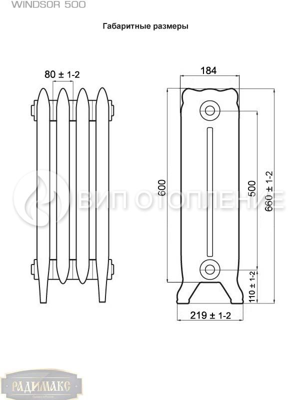 Радиаторы чугунные секционные «РАДИМАКС WINDSOR 500» предназначены для применения в системах водяного отопления жилых, административных и общественных зданий. Рассчитаны на эксплуатацию при максимальной температуре теплоносителя 110 °С и рабочим давлением до 10 атм. Приборы испытаны на заводе давлением не менее 16 атм. и опрессованы для выявления возможных протечек и скрытых дефектов.