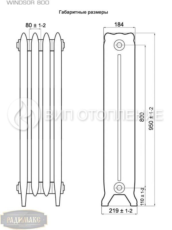 Радиаторы чугунные секционные «РАДИМАКС WINDSOR 800» предназначены для применения в системах водяного отопления жилых, административных и общественных зданий. Рассчитаны на эксплуатацию при максимальной температуре теплоносителя 110 °С и рабочим давлением до 10 атм. Приборы испытаны на заводе давлением не менее 16 атм. и опрессованы для выявления возможных протечек и скрытых дефектов.