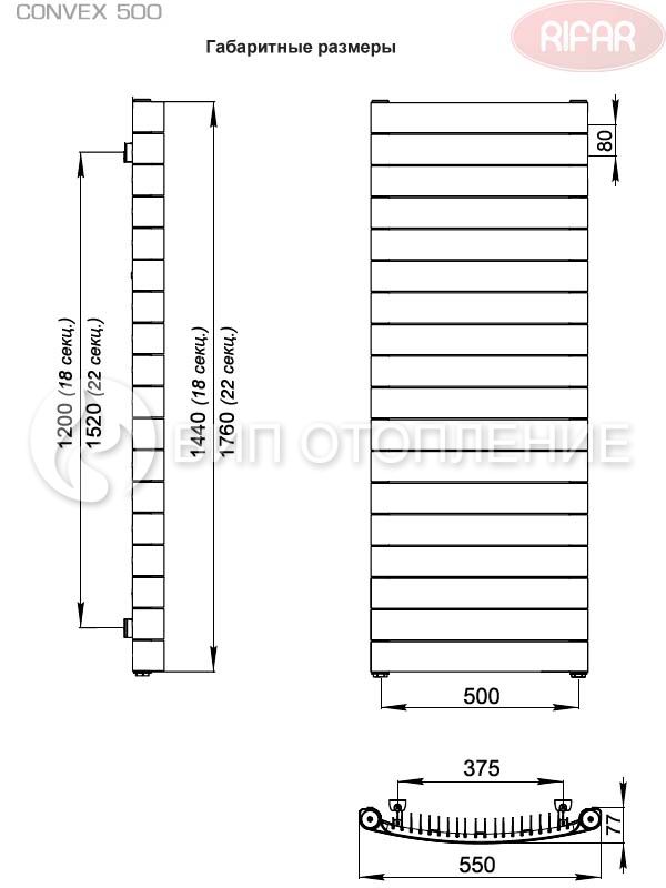 Серийно выпускаются вертикальные радиаторы двух типоразмеров – «CONVEX 500 Титан» с 18 секциями (высотой 1440 мм) и «CONVEX 500 Титан» с 22 секциями (высотой 1760 мм). Теплоотдача этих приборов составляет 1782 и 2176 Вт соответственно. Модели «CONVEX 500 Титан» выполнены в одном из базовых цветов линейки «Rifar» – сером Титан. Приборы имеют конструкцию с нижним, разнесенным по краям, подключением с межосевым расстоянием 500 мм.