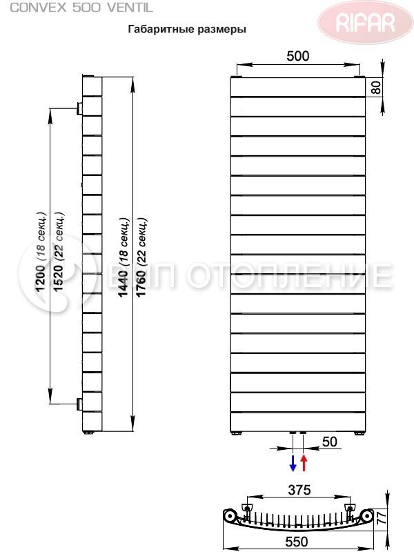 Серийно выпускаются вертикальные радиаторы двух типоразмеров – «CONVEX VENTIL 500 Антрацит» с 18 секциями (высотой 1440 мм) и «CONVEX VENTIL 500 Антрацит» с 22 секциями (высотой 1760 мм). Теплоотдача этих приборов составляет 1782 и 2176 Вт соответственно. Приборы модификации «VENTIL» имеют конструкцию с центральным нижним подключением под стандартный узел с межосевым расстоянием 50 мм. Модели «CONVEX VENTIL 500 Антрацит» выполнены в одном из базовых цветов линейки «Rifar» – черном Антрацит.