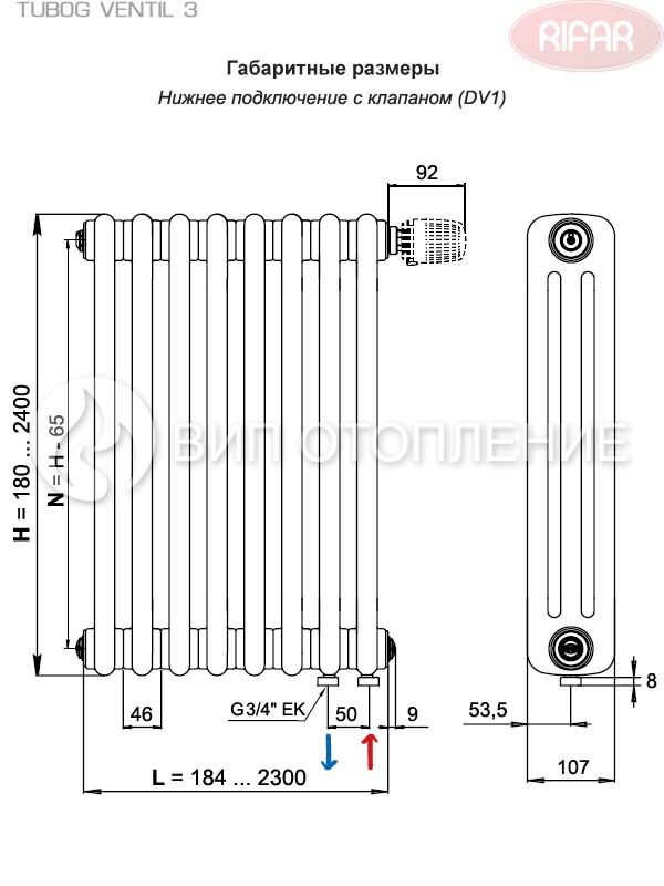 Данная модификация радиатора «TUBOG VENTIL 3» поставляется в варианте с нижним односторонним подключением с предустановленным термостатическим клапаном (DV1), в комплекте с 2 заглушками ¾" и краном Маевского ¾" (воздухоотводчиком), окрашена в один из базовых цветов «Rifar» – серый Титан, имеет матовую поверхность. Конструкция радиатора с нижним подключением является симметричной, поэтому его можно подключить как с левой, так и с правой стороны. При необходимости можно заказать вариант с нижним разносторонним подключением, центральным, а также в исполнении без термоклапана.. Для автоматического регулирования потока теплоносителя рекомендуется дополнительно приобрести и установить на клапан термогерулятор (термоголовку).