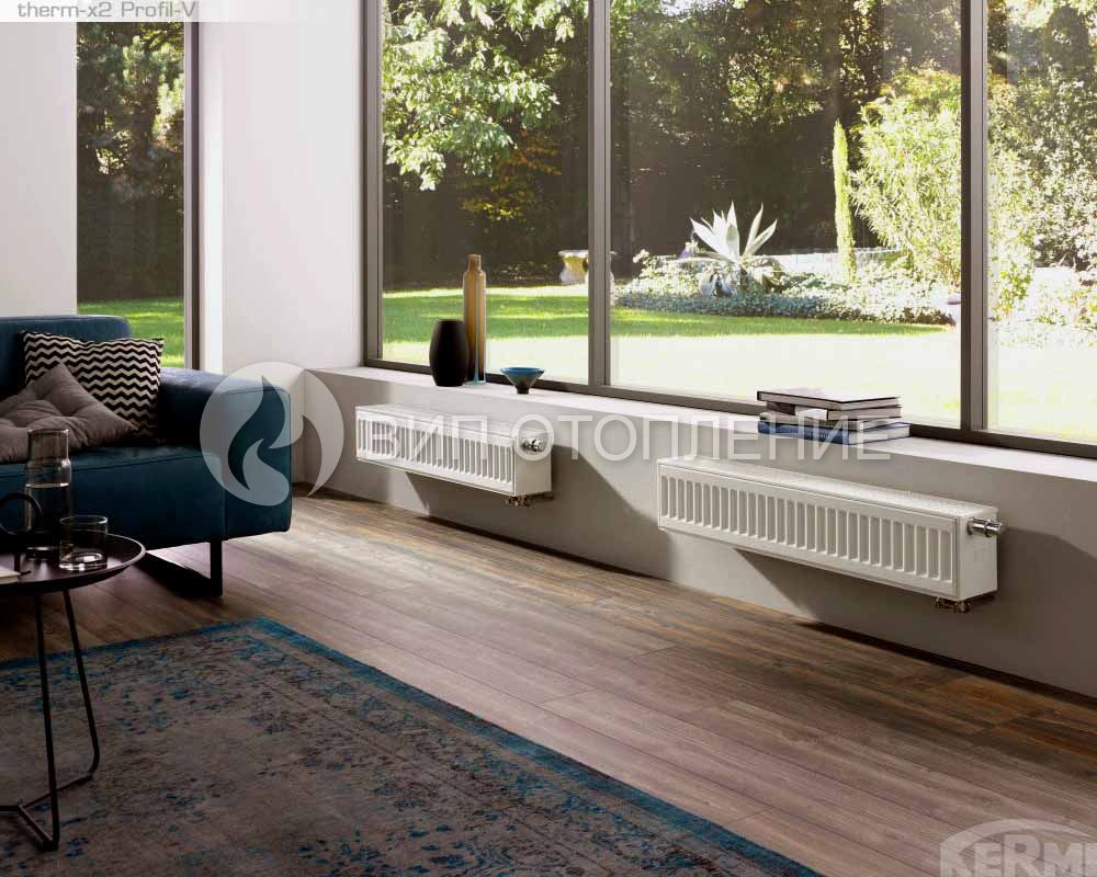 Радиатор «therm-x2» снабжен новейшей запатентированной технологией «x2», основанной на последовательной обвязке по теплоносителю. Согласно этому принципу, теплоноситель из подающего трубопровода сначала поступает в переднюю панель радиатора, обеспечивая более высокую температуру ее поверхности и тем самым увеличивая долю теплоотдачи излучения до 100 %. Принудительная циркуляция способствует сокращению времени прогрева и работы 25 %. В режиме неполной нагрузки системы мощности передней панели чаще всего оказывается достаточной. Задняя панель при этом выполняет функцию отражающего экрана и подключается лишь тогда, когда потребуется большая мощность, способствуя быстрому нагреву помещения за счет своих конвекционных свойств. В результате подобной разнице температур между линиями подачи и обратки приводит к повышению энергоэффективности радиатора и сокращению потерь при распределении и выработке тепла. Последовательное протекание теплоносителя через панели радиатора позволяет не только существенно экономить энергию (до 11 % по сравнению с обычными панельными радиаторами), но и обеспечивает высокий уровень теплового комфорта даже в низкотемпературных системах.