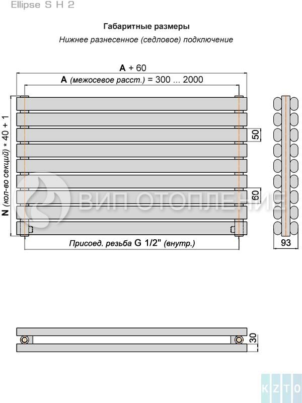 Модель «Ellipse S H 2-2000-3» представляет собой расположенные горизонтально стальные колонки овального сечения 50×30, приваренные широкой стороной к круглым трубам-коллекторам в два ряда по 3 штуки (расстояние между осями коллекторов – 2000 мм). Радиатор довольно компактен – глубина составляет 93 мм.