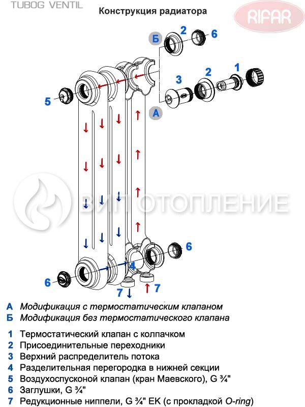 Данная модификация радиатора «TUBOG VENTIL 2» поставляется в варианте с нижним односторонним подключением с предустановленным термостатическим клапаном (DV1), в комплекте с 2 заглушками ¾" и краном Маевского ¾" (воздухоотводчиком), окрашена в базовый цвет – стандартный белый RAL 9016, имеет глянцевую поверхность. Конструкция радиатора с нижним подключением является симметричной, поэтому его можно подключить как с левой, так и с правой стороны. При необходимости можно заказать вариант с нижним разносторонним подключением, центральным, а также в исполнении без термоклапана.. Для автоматического регулирования потока теплоносителя рекомендуется дополнительно приобрести и установить на клапан термогерулятор (термоголовку). По отдельному запросу прибор может быть выполнен в цветном варианте. Наценка за покраску радиатора порошковыми эмалями в стандартные цвета «TUBOG» составит 15%, за исключением цветов Титан (серый) и Антрацит (черный), которые идут без наценки. Окрашивание жидкими эмалями в любой цвет по классификации RAL (из каталога К7-Classic) дороже на 35%, за последующую отделку глянцевым или матовым лаком наценка 20%.