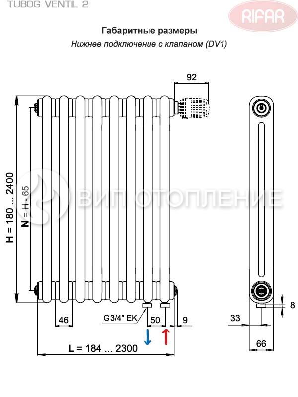 Стальной трубчатый радиатор «RIFAR TUBOG VENTIL 2037-48 DV1 RAL 9016» предназначен для применения в системах отопления жилых, административных и общественных зданий. Допускается использование в открытых и закрытых отопительных системах, подключенных к внешним теплосетям по зависимой или независимой схемам. Подходит для эксплуатации в системах с рабочим давлением до 16 атм и температурой теплоносителя до 110 °С. Модель выполнена в белом цвете, имеет двухтрубчатую конструкцию с нижним подключением, состоит из 48 секций, сваренных друг с другом в коллекторной части, расстояние между осями коллекторов – 300 мм. Исполнение со встроенным сверху термостатическим клапаном.