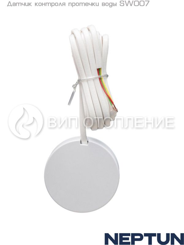 Датчик контроля протечки воды «Neptun SW007» – это проводной датчик круглой формы с фирменным дизайном и длиной провода 3 метра. Предназначен для фиксации протечки воды и передачи аварийного сигнала на модуль управления. Совместим со всеми модулями управления «Neptun».