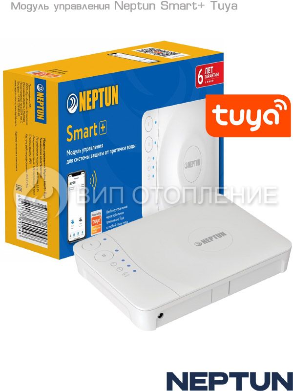 Модуль управления «Neptun Smart+ Tuya» – это центральный контроллер нового поколения в системах контроля протечки воды. Управление, мониторинг и настройка осуществляется с помощью мобильного приложения «Tuya Smart Home». Предназначен для обработки сигналов от проводных и беспроводных датчиков контроля протечки воды и выдачи управляющего сигнала шаровым кранам с электроприводом для блокировки подачи водоснабжения. Обеспечивает световое и звуковое уведомление об аварии, а также отсылает push-уведомления на смартфон пользователя. Входит в состав комплекта для защиты от протечек «Neptun PROFI Smart+ Tuya».