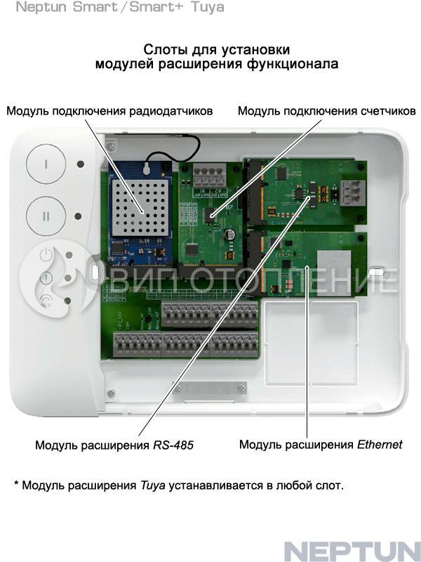 Умный модуль управления «Neptun Smart Tuya» можно функционально расширить, установив дополнительные модули:– плата расширения RS-485 для создания системы диспетчеризации (работает при подключении к облаку SST Cloud); – плата расширения Ethernet для проводного подключения к роутеру через витую пару при недоступности беспроводной связи (работает при подключении к облаку SST Cloud);– модуль подключения счетчиков для контроля показаний с приборов учета расхода воды (до 2 счетчиков, для увеличения количества контролируемых счетчиков можно установить дополнительный модуль подключения счетчиков). Настройка модуля расширения производится с помощью приложения «Tuya Smart» или «SST Cloud» (обновление показаний счетчиков – каждые 10 минут); – модуль подключения радиодатчиков для организации соединения с беспроводными датчиками контроля протечки воды, работающих на частоте 868 МГц (до 50 радиодатчиков).Модуль расширения Tuya для подключения устройства к платформе «умного дома Tuya» устанавливается в любом слоте (не совместим с модулями расширения RS-485 и Ethernet).