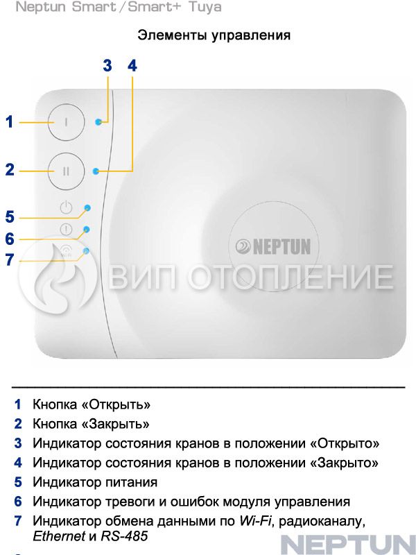 Для индикации первичной информации о событиях модуля управления «Neptun Smart Tuya» в конструкции предусмотрено пять светодиодов и звуковой излучатель. На внешней панели прибора расположены кнопки открытия и закрытия кранов, индикаторы состояния кранов, индикатор питания, индикатор аварийных состояний и индикатор обмена данными по различным интерфейсам (Wi-Fi, RS-485, Ethernet, радиоканал).